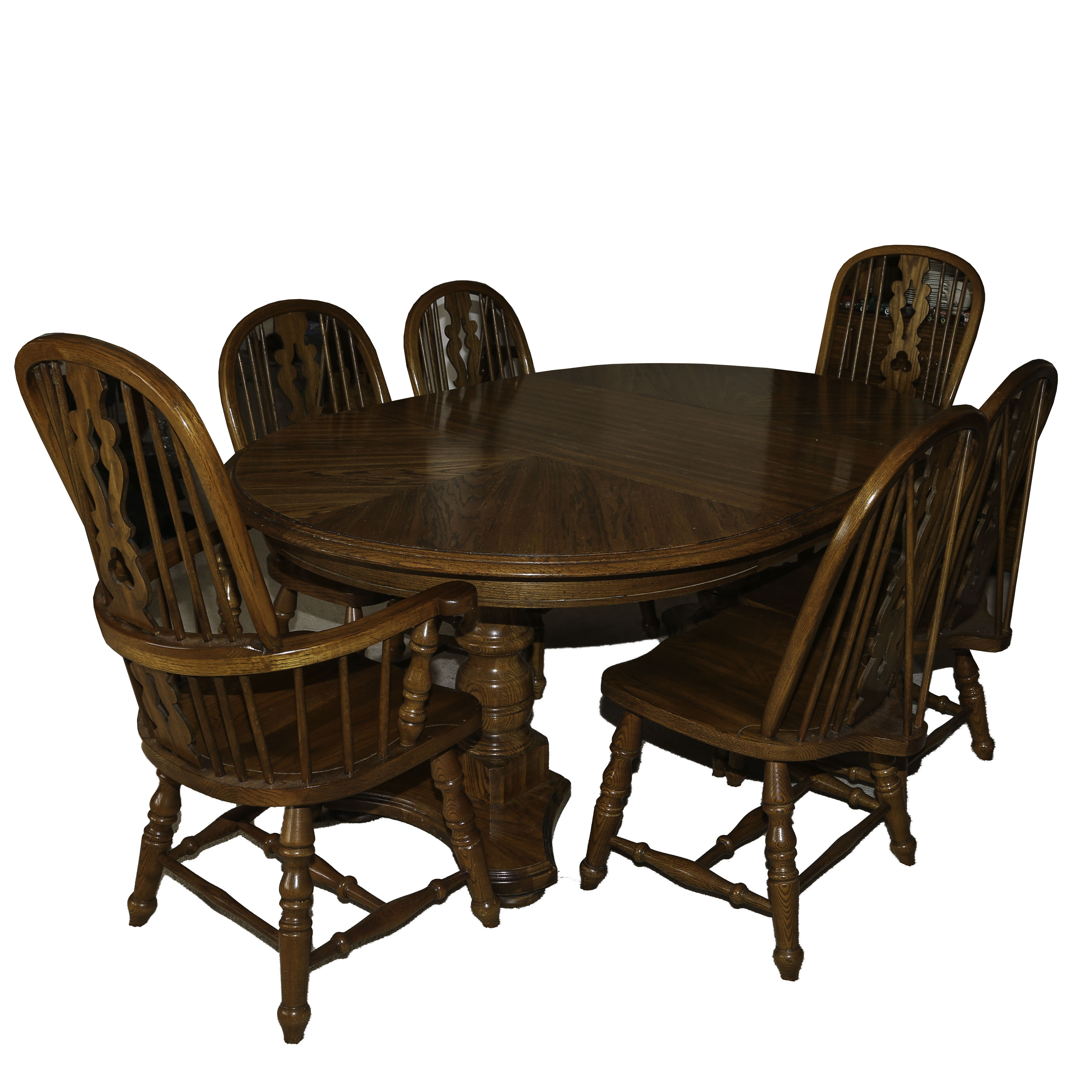 Oak Double Pedestal Dining Table Wheel Back Spindle Chairs 20th