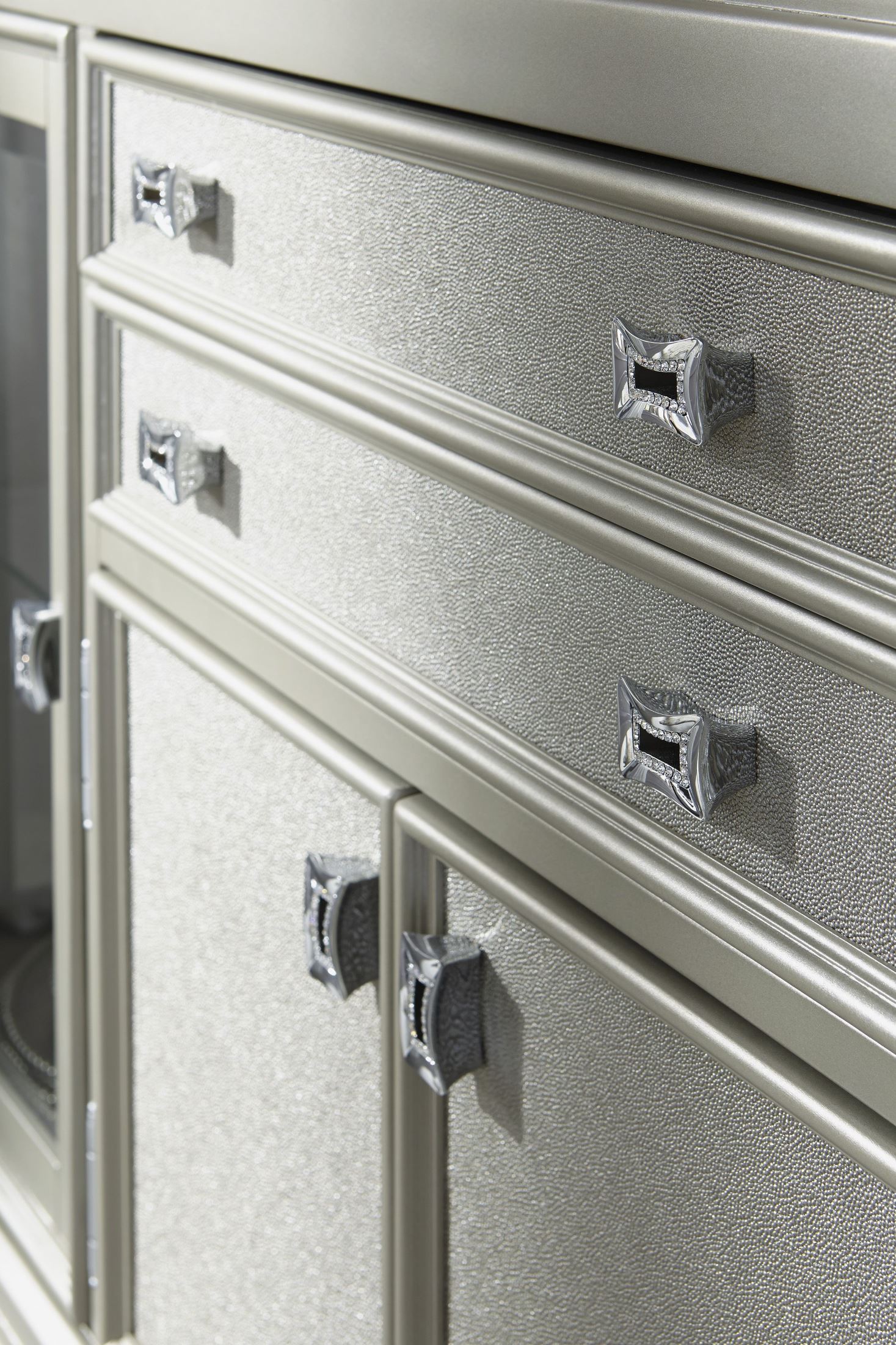 The dining table has silvery textured pvc under a glass top with cabriole legs. Faux shagreen texturing on the drawer and door fronts a touch of bejeweling on the sculptural pulls and glass encased display space elevate this server to interior fashions a list. Coralayne silver finish 7 pc.