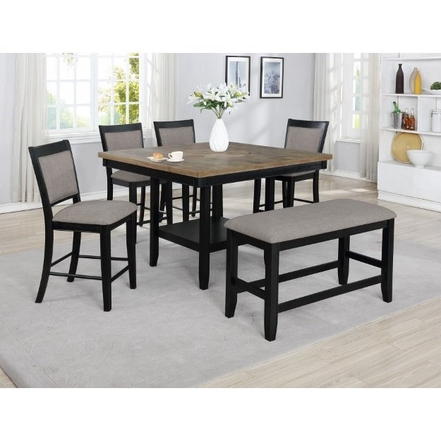 Dining table set in brownthis manning counter height table from crown mark features a light brown finish a bottom shelf square top with a lazy susan and sturdy legs.