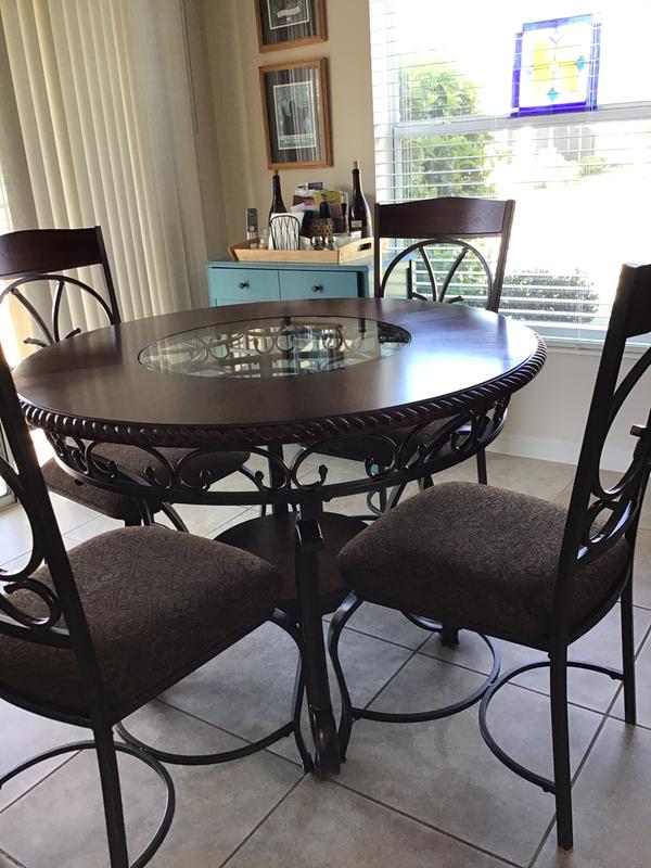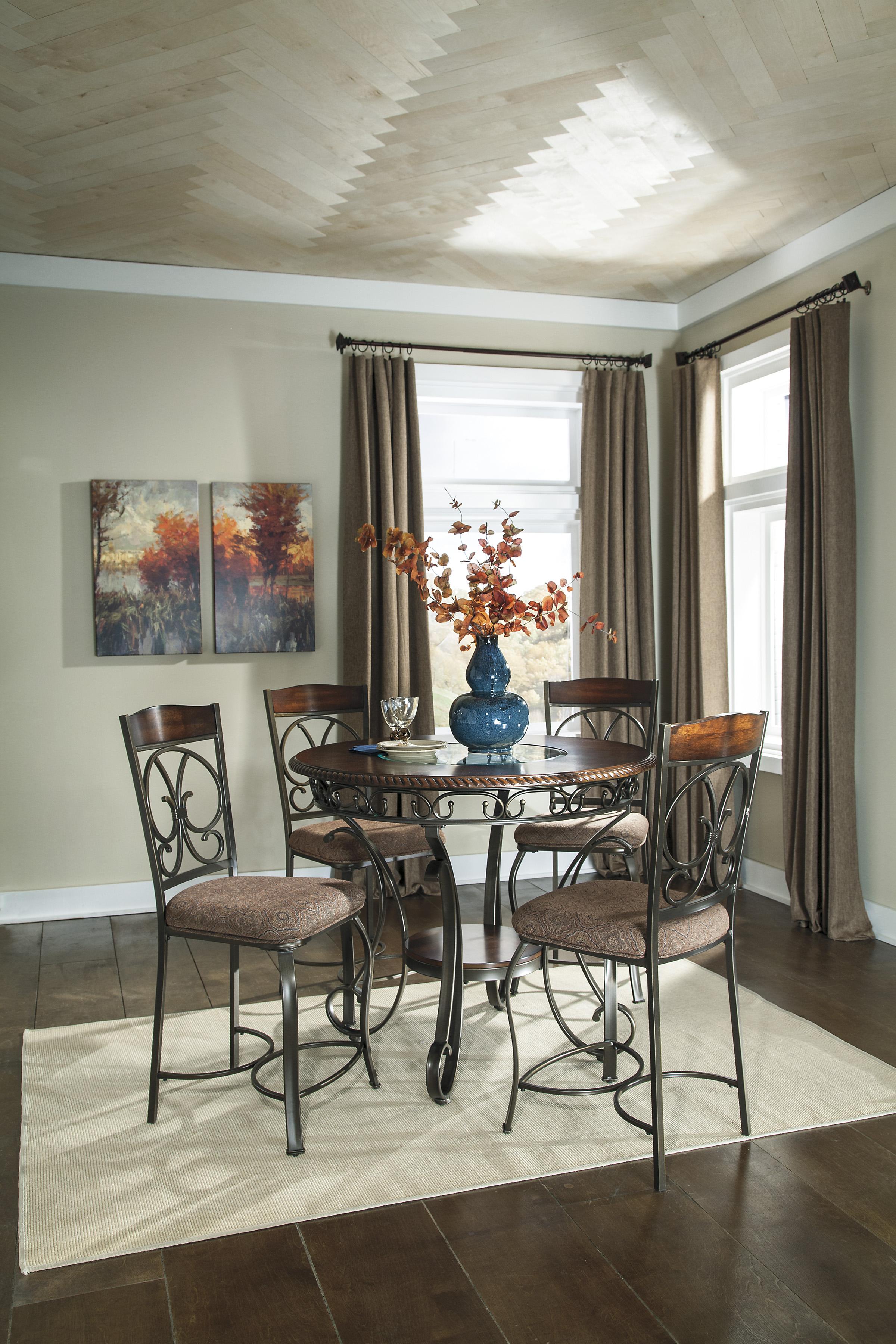 Dine in old world style with the glambrey 5 piece counter high set from the glambrey dining collection by ashley furniture. Brown incorporating a touch of old world glam with its scrolled metal accents the glambrey dining room table set mixes various textural elements and rich earth tones in a way thats so pleasing to the palette. The circular inset glass on the dark finished tabletop serves up light and airy contrast.